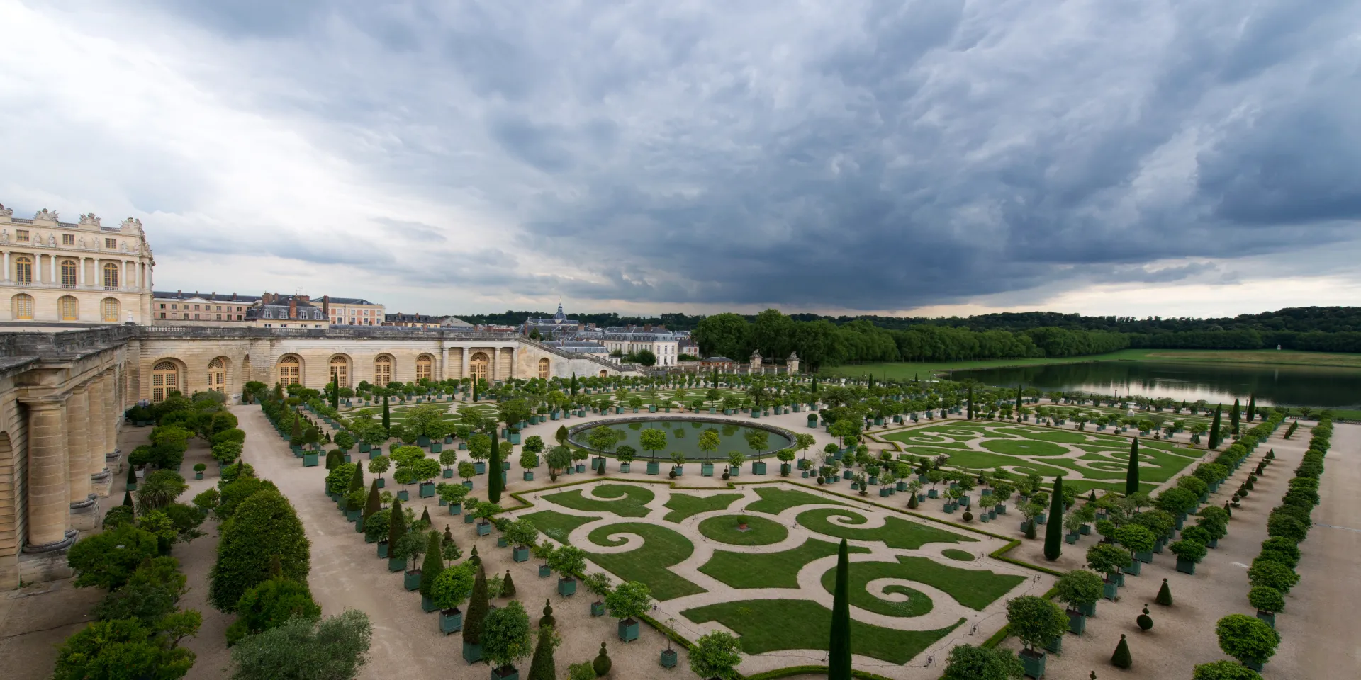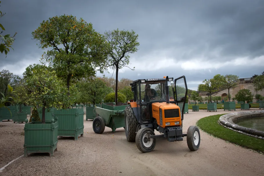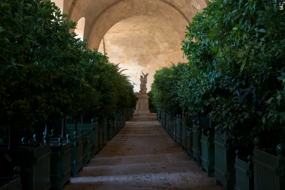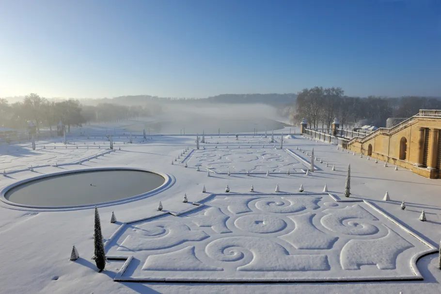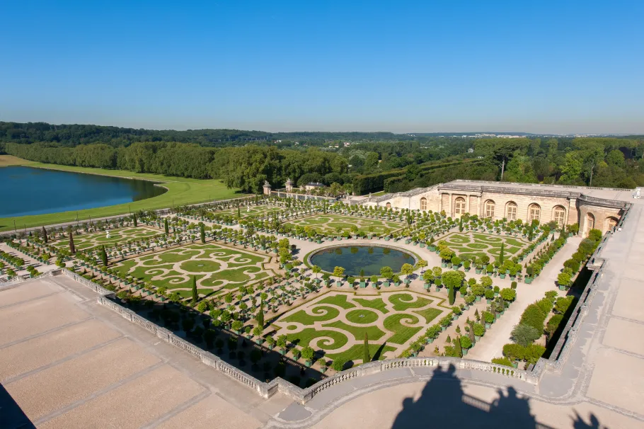 The Orangery parterre covers no less than three hectares. During the reign of Louis XIV it was adorned with several sculptures which are now kept in the Musée du Louvre. It consists of four grass sections and a circular pool. In summer there are 1055 containers with orange trees, palm trees, oleander, pomegranate trees and Eugenia bushes that are kept inside the building during winter.