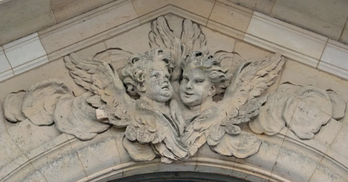 Two cherub heads, framed wings, seem to burst out of a cloud.