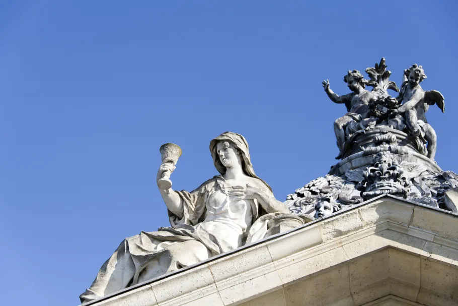 Represented in a reclined position, the allegory of Religion is wearing a dress and a cloak pulled up over he head like a veil. In her outstretched right hand she is holding a chalice, which is an image of Christ’s presence in his Church. To her left there is a closed book sitting under the base of a column, symbolising the Church’s foundation on the Holy Scriptures.