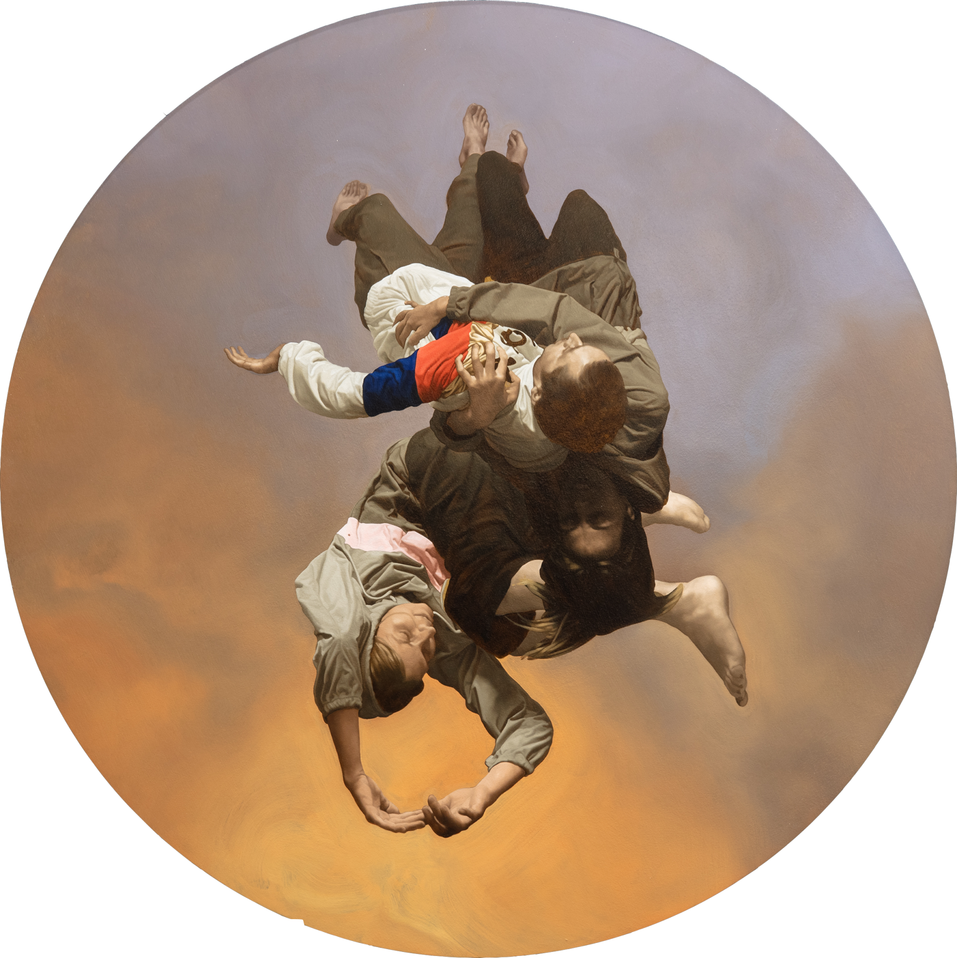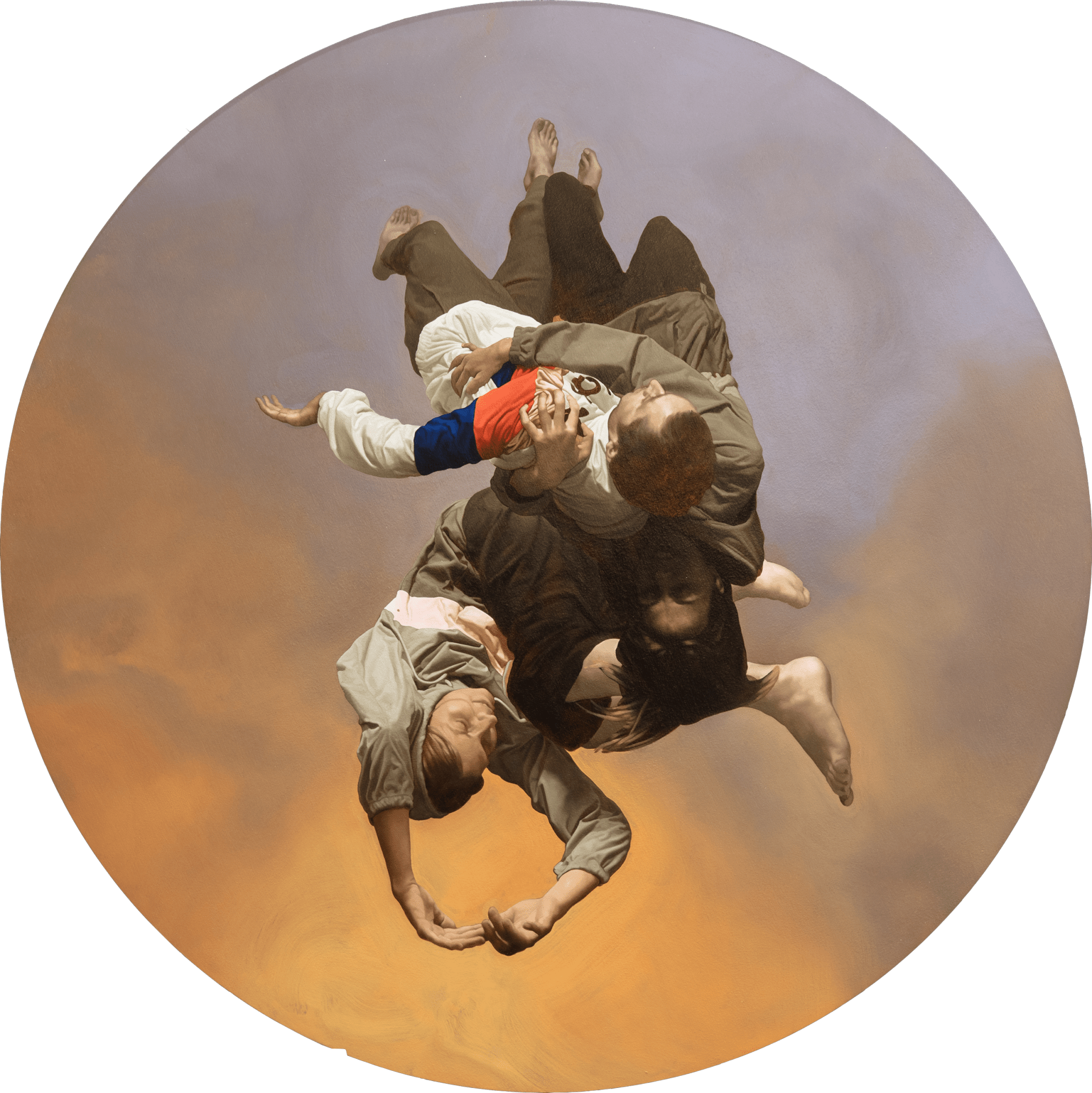Guillaume Bresson’s paintings are characterized by their realism. In order to achieve this photographic accuracy, the painter follows a process beginning with preparatory photoshoots in his studio using models. Their bodies are choreographed, creating poses and theatricalized movements that are reminiscent in some respects of Baroque painting. In the editing process, the artist isolates and detaches the bodies and then rearranges them into a group. In this way, Guillaume Bresson constructs paintings in which body language plays a central role in the creation of the narrative.