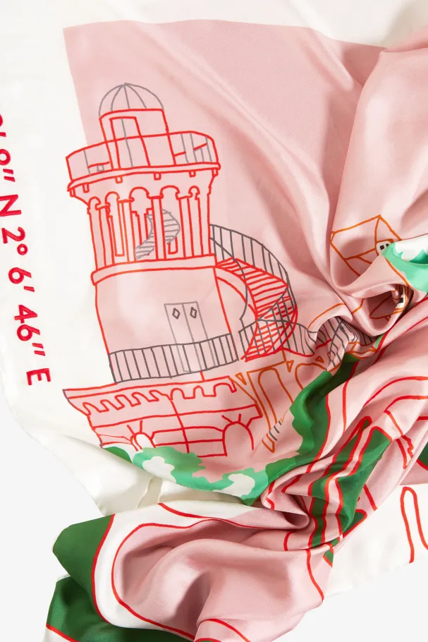 This new collaboration, in which the art of embroidery and historical heritage are thriving, celebrates the Queen's Hamlet, Marie-Antoinette's country retreat. Touched by the history and intimacy of this secret world, Alexandra Senes, founder of Kilometre Paris, wanted to pay tribute to the imagination and fantasies of Marie-Antoinette by dedicating a large silk scarf to her memory that is elegant, unique and ornamented with motifs inspired by the architecture and topography of the location. The design includes the Marlborough Tower sitting on the rocks, its shape unmistakeably evocative of a lighthouse with its wrought-iron staircase, the Queen's boudoir, the surrounding thatched cottages and the silhouette of a coach racing at full speed along the walks in the royal park.