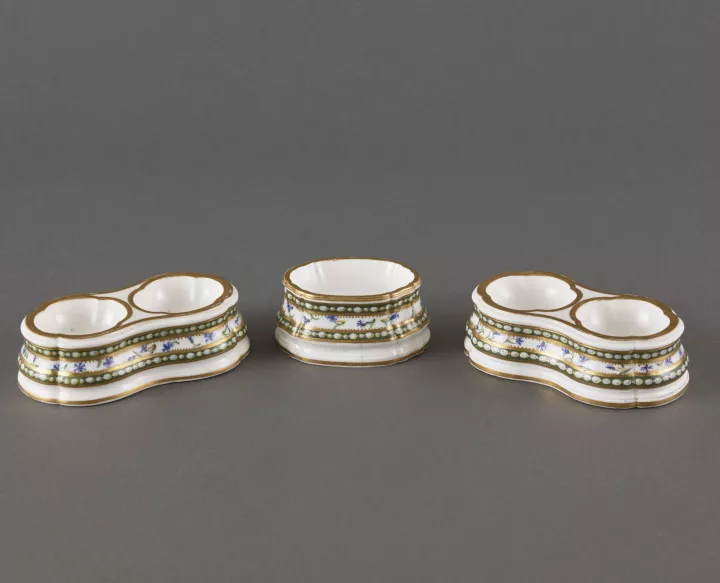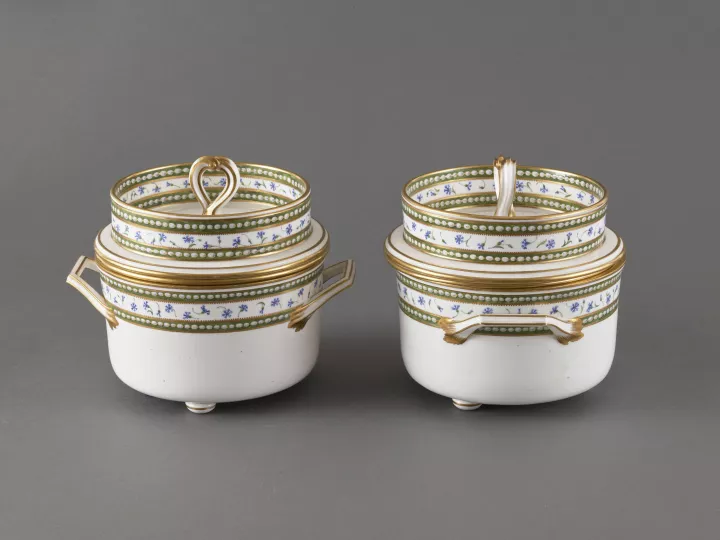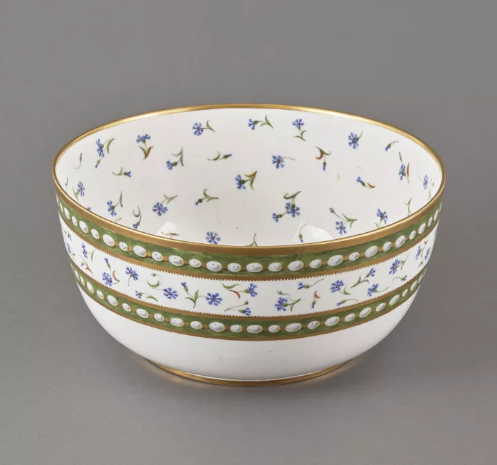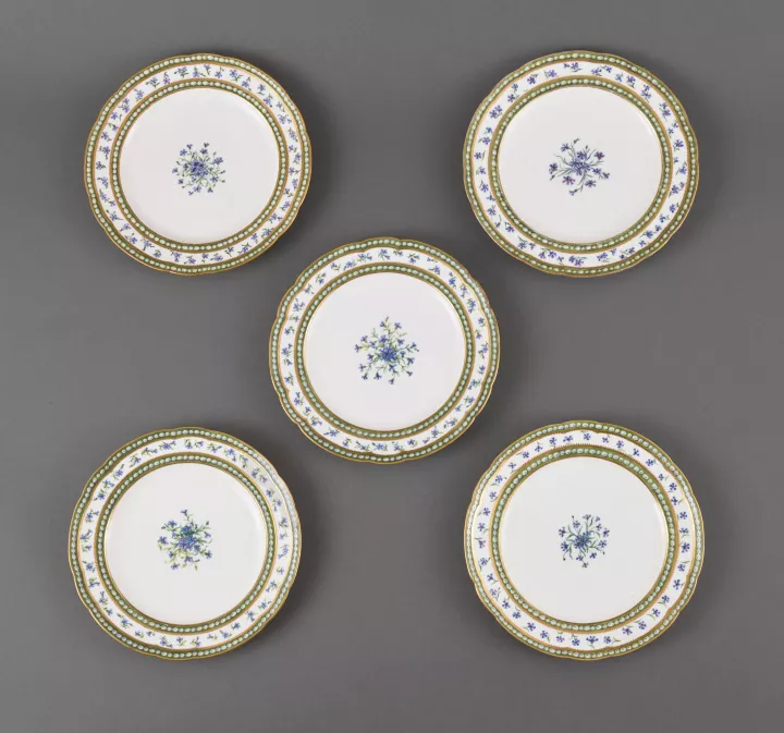 This service is a masterpiece of the Manufacture de Sèvres, which commissioned around twenty painters and several gilders to create it. It is remarkable for its refined decoration, with a perfect harmony of colours dominated by blue, green and white, underlined by gold-painted lines. Each of the 295 pieces was decorated with cornflower motifs in bouquets and individually, surrounded by two rows of pearls painted on a green background.