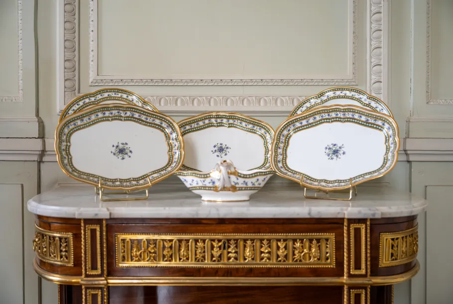 The Manufacture de Sèvres archives reveal “the extreme promptness with which the Queen wished to have the service created for her”. In fact, the “perles et barbeaux” service is a true testament to Marie-Antoinette’s assertive taste. The pearl motif on the green border was a personal choice of the Queen. She was also particularly fond of the cornflower motifs used to decorate her apartment at the Petit Trianon, particularly in the famous “wheat-ear” furniture in her bedroom.