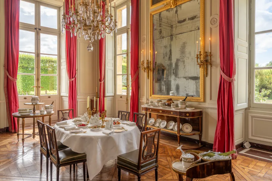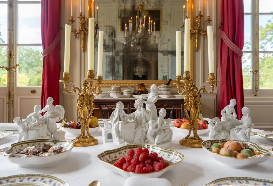 The dining room in the Petit Trianon has a new feature, following the return of a set of 75 porcelain items from the “Perles et Barbeaux” service, made by the Manufacture de Sèvres in 1782 for Queen Marie-Antoinette. The service is a precious testimony to 18th century tableware, and will be displayed on a dessert table at the Petit Trianon from 18 July.