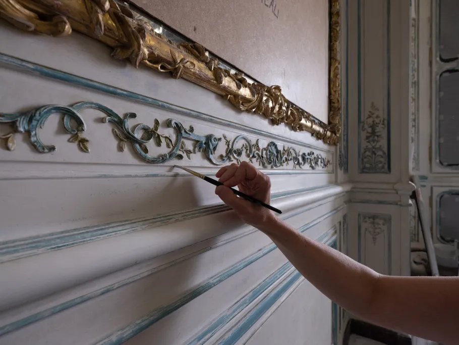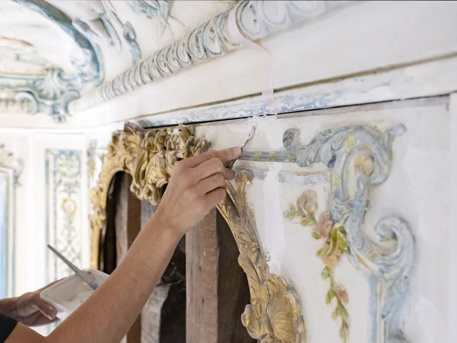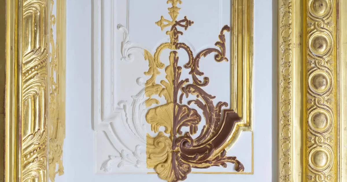 During the restoration of 1747, the Dauphin’s bedchamber was decorated by the great artists of the time, such as Jacques Verberckt, who carved the wood panelling based on designs by Ange-Jacques Gabriel, and Jean-Baptiste Pierre, who did the overdoor paintings (these works are held in the Palace of Versailles collections and will be put back in place once this restoration is complete). The room was completely transformed under Louis-Philippe and part of the décor was replaced with paintings set into the walls. In the 20th century, the wood panelling and gilding were restored, and the fireplace, which was discovered in storage, was replaced. Today, this room is one of the most opulent and best preserved in the princely apartments, and much of its original décor is considered a masterpiece of rococo art. The current project aims to restore the brilliance of the beautifully crafted gilded wood panelling, which is clogged with grime and full of gaps. The restoration will endeavour to clean the existing décors and fill in the gaps, while respecting their original appearance, and then enhance them by repainting the plain ‘blanc de Roi’ backgrounds using standard techniques.