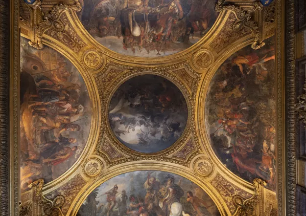 The restoration of the ceiling of the Diana room, started in October 2024 is almost finished, revealing the restored splendor of its painted vault and stucco. Discover the behind-the-scenes look at the prodigious work of the painting restorers.