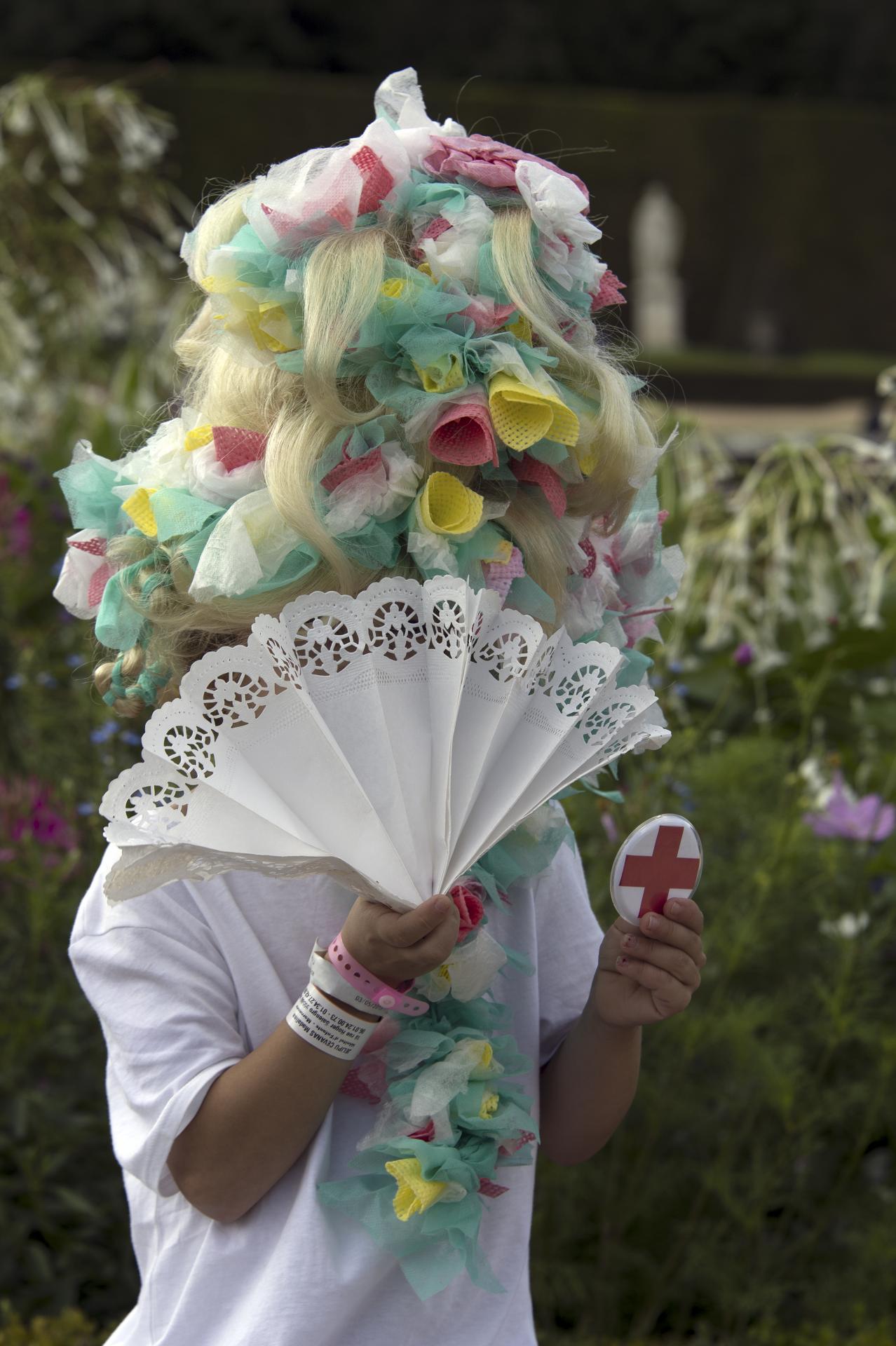 In 2018 and 2019, young patients from the Margency Children’s Hospital were able to discover the Palace of Versailles through the prism of Court fashion. Following visits to the Palace and workshops held at the hospital, they turned medical items into creative materials and made wigs from gloves, masks, tubes and capsules. Photographs of the children wearing their creations were exhibited in the Girandole Grove from 21 October to 3 November 2019.