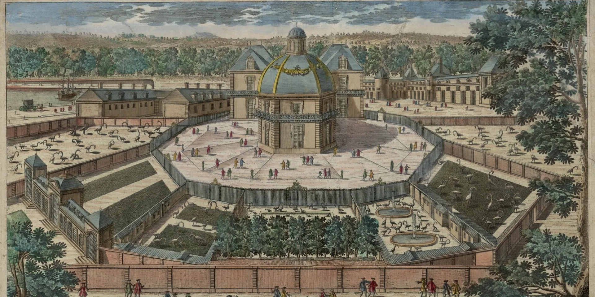 Souhaitée par Louis XIV et construite par son architecte, Louis Le Vau dès 1663, la Ménagerie royale de Versailles accueille un grand nombre d'animaux exotiques, dispersés dans des enclos, et disposés autour d'une tour permettant une vue panoramique. Depuis l'Antiquité, en effet, la tradition s'était solidement établie d'entretenir, non loin du souverain, des collections d'animaux exotiques, paisibles ou féroces.