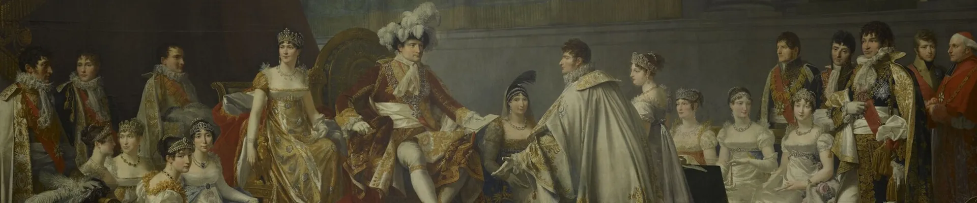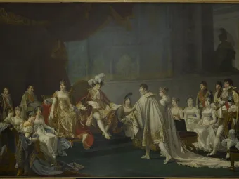 Commandé par l’Empereur pour illustrer le mariage de son frère Jérôme, roi de Westphalie avec Catherine de Wurtemberg, ce tableau de Jean-Baptiste Regnault, représente dans le plus grand faste les membres de la famille impériale. Assis sur un trône surélevé par quelques marches, l’Empereur « règne » sur son clan comme sur l’Empire...