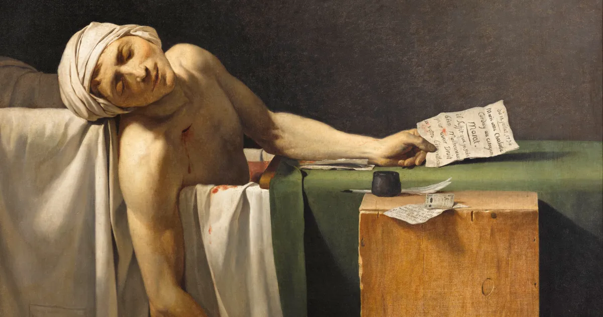Jean-Paul Marat, surnommé "l'ami du peuple", était connu pour mener des combats politiques. Sa célèbre phrase : « Rien de superflu ne saurait appartenir légitimement, tandis que d’autres manquent du nécessaire », reflète bien le fond de sa pensée sur la condition sociale. Tragiquement assassiné, il est représenté agonisant dans sa baignoire.