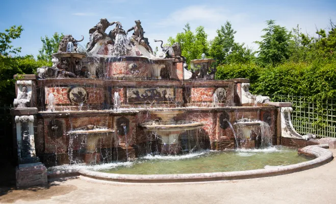 Nestled in the Grand Trianon’s gardens, the Buffet d’Eau is an Italian-inspired fountain monument built by Jules Hardouin-Mansart in 1702, before being altered and tweaked several times on Louis XIV’s orders. Despite a very frontal feel, this majestic monument measures 12 meters deep from the front of the basin to the back of the stonework.