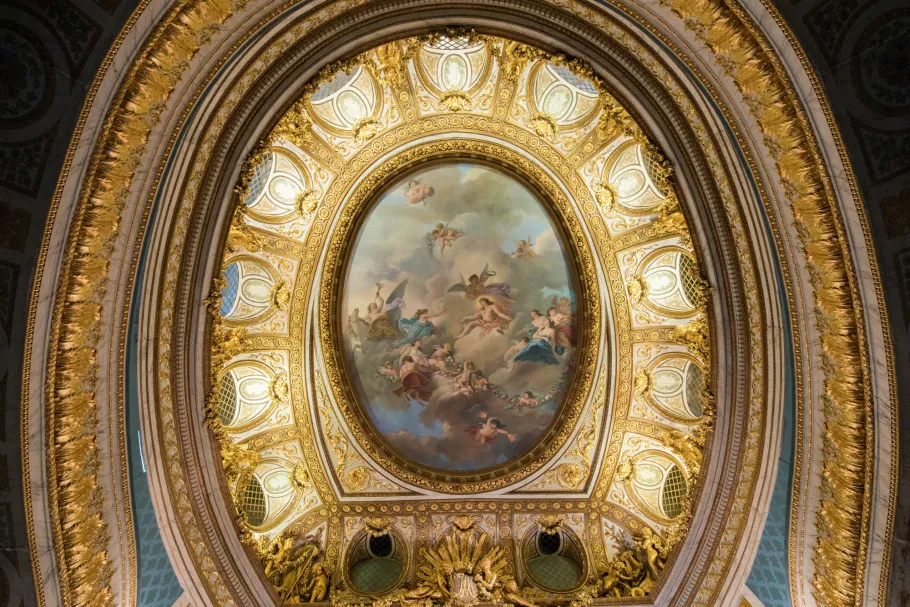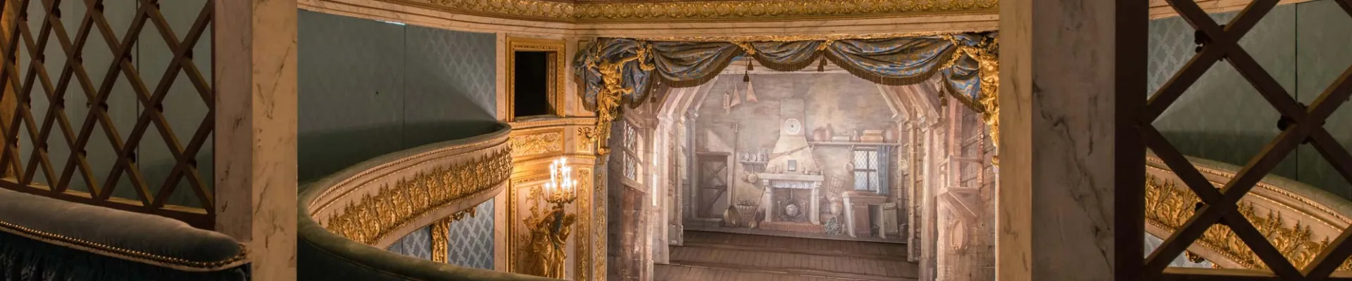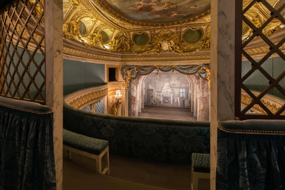 The interior of the Queen’s Theatre, with its blue decoration embellished with gold and its ceiling depicting Apollo surrounded by Graces and Muses, contrasts with the deliberately discreet façade. Marie-Antoinette herself performed here in comedies.